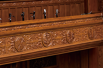 議場の手すりや壁には稲穂や鎌など丁寧な木彫が施されています。議事堂の外側の石の重みと内部の重厚な木の輝き。これぞ歴史です。