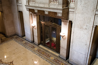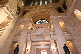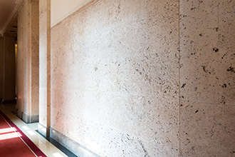 議事堂は「石の博物館」とも呼ばれるほど、建設時日本全国から様々な石が集められました。中でも耐震性、耐火性で中央塔付近に多用されたのは沖縄からのサンゴ石灰石。優しいピンク色が、周囲の重々しさからの少しの息抜きに。