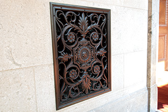 美しいデザインの空調の出口。まだクーラー技術のない時代、地下に大きな氷を置き水を掛けながら風を作って全館に送り出していました。完成当時、夏の盛りに議会が開かれなかったのは、こうした理由のためかも。