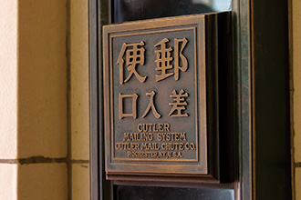 国産品でない1つ目はこの郵便差入口。アメリカ製。このポストは現役で、地下の集配所に貯まる設計です。でもたまにこのシューターに詰まってしまうことも。郵便屋さんは備え付けの針金で探ってみるそうですが…。