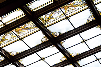 そして国産品でない3つ目は議場の天井にあるステンドグラス。中央広間の上部にもありました。このステンドグラスの原料はイギリスからの輸入だそうです。